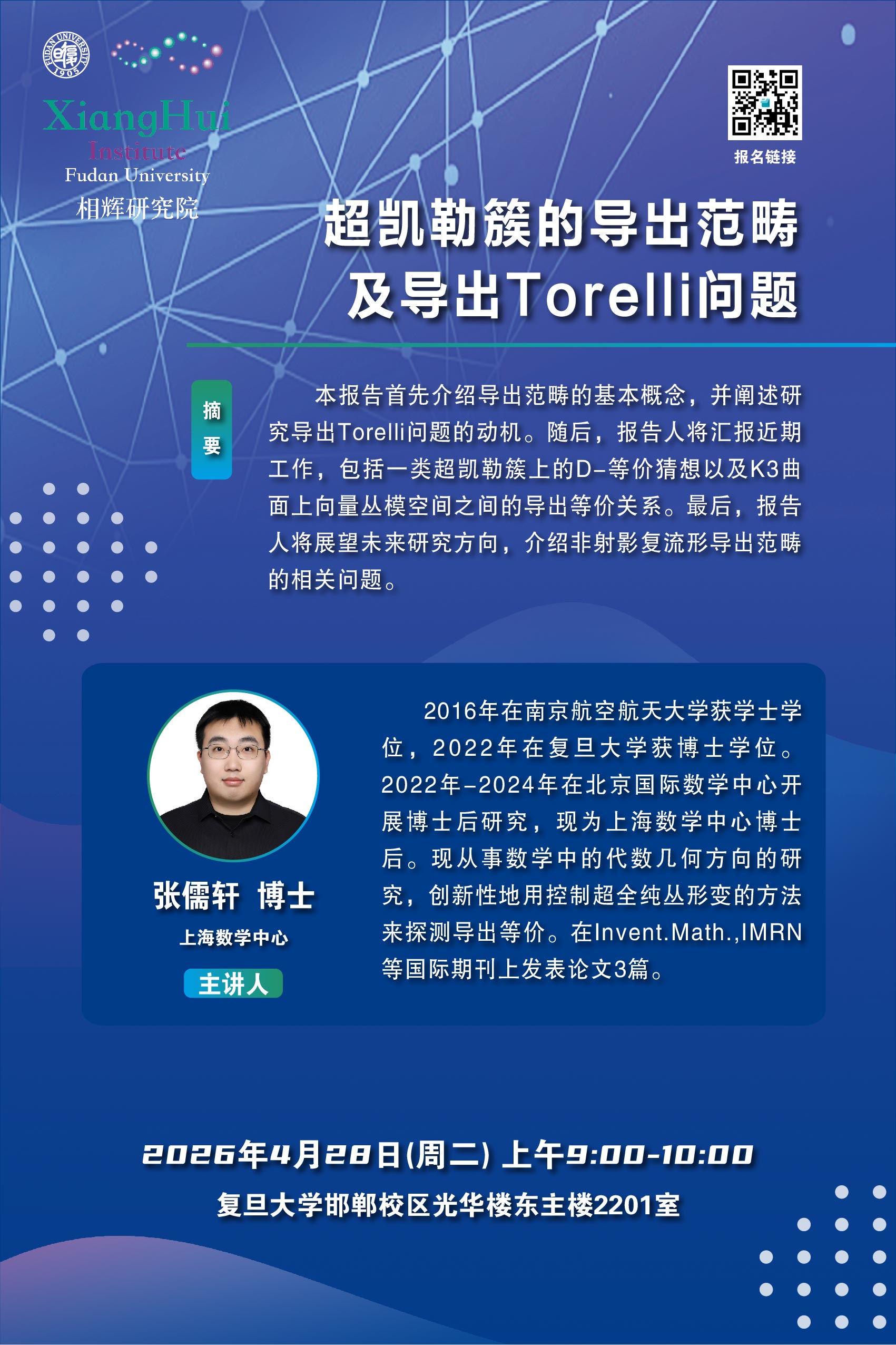 本报告首先介绍导出范畴的基本概念,并阐述研究导出Torelli问题的动机。随后,报告人将汇报近期工作,包括一类超凯勒簇上的D-等价猜想以及K3曲面上向量丛模空间之间的导出等价关系。最后,报告人将展望未来研究方向,介绍非射影复流形导出范畴的相关问题。张儒轩.jpg