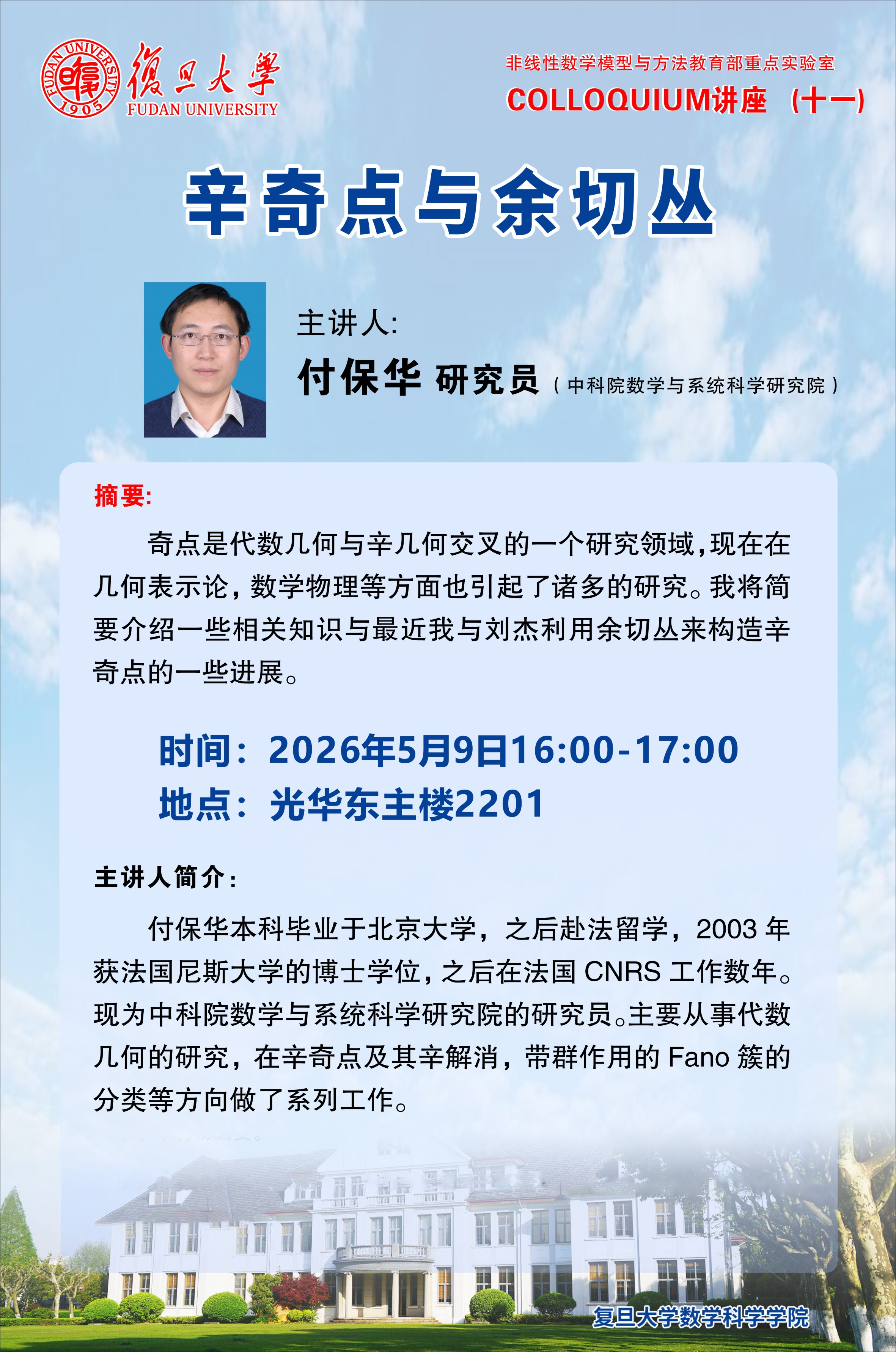 辛奇点是代数几何与辛几何交叉的一个研究领域,现在在几何表示论,数学物理等方面也引起了诸多的研究。我将简要介绍一些相关知识与最近我与刘杰利用余切丛来构造辛奇点的一些进展。COLLOQUIUM讲座11.jpg